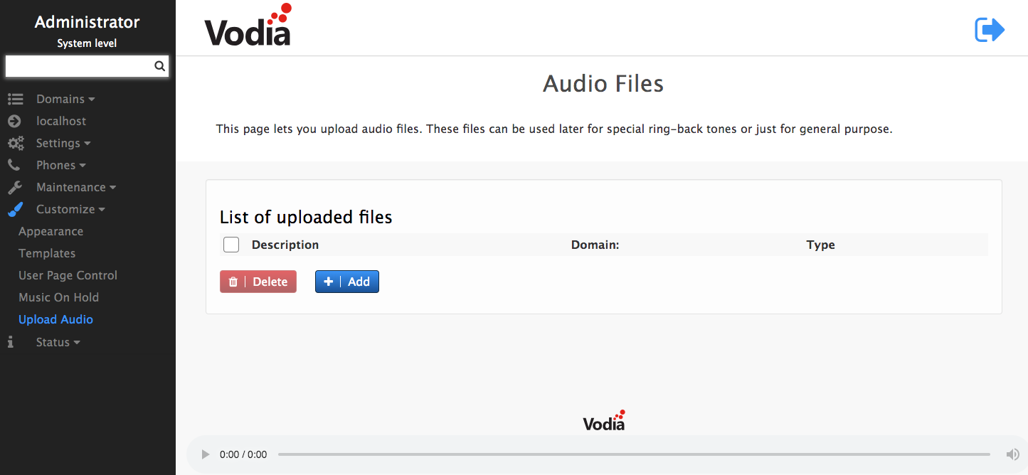 You have the ability to customize by uploading your own audio files to use for general purposes or ring-back tones. To add an audio file: